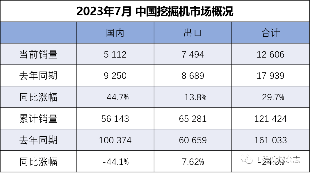 机械工业协会对挖掘机主要制造企业统计,2023年7月销售各类挖掘机12606台,同比下降29.7%,其中国内5112台,同比下降44.7%;出口7494台,同比下降13.8%。2023年1-7月,共销售挖掘机121424台,同比下降24.6%;其中国内…......