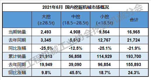 2021年6月,共计销售各类挖掘机械产品23,100台,同比下降6.2%。其中,国内市场销量16,965台,同比下降21.9%;出口销量6,135台,同比涨幅111.5%。
