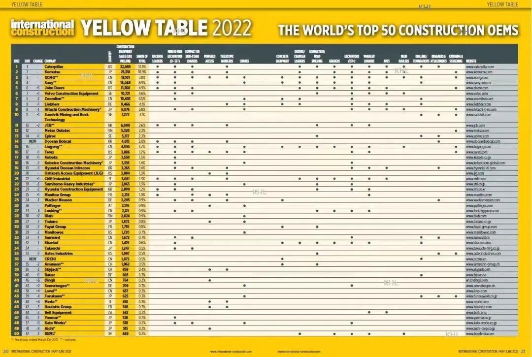 6月1日,全球工程机械行业知名资讯集团KHL旗下《International Construction》杂志权威发布Yellow Table榜单。榜单显示,TOP50工程机械制造商2022年总销售额为2306亿美元,为该榜单有史以来的最高数字之一。增长的一个重要原因是美国制造商业绩的增长,2022年美国制造商销售额占全球总收入26%以上,比2021年增加五个百分点。相比之下,中国军团整体排名略有下滑。